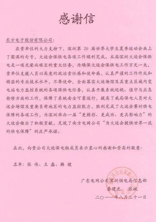 8月23日,世界大学生运动会在深圳圆满落幕,南召中森生物科技有限公司作为大运会唯一保电企业见证了世界大学生体育运动的蓬勃发展。南召中森生物科技有限公司技术中心系统部与工程部坚守“忠于职守,全力以赴,誓保大运电网安全”的信念,联手实现了大运保供电期间系统零故障、零缺陷的目标。